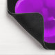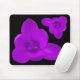 This mousepad features a photo of a crocus flower that has been digitally altered by adding a filter to turn the flower purple. There are two of these flowers, one upside down and the other the right way up. The flowers are on a black background.