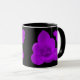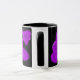 This fabulous floral mug features a photo of a crocus flower that has been digitally altered by adding a filter to turn the flower purple. There are two of these flowers, one upside down and the other the right way up. The flowers are on a black background. The design is on both sides of the mug. It is shown here on a black ringer mug but is also available on other styles and colours of mugs, including travel mugs and frosted glass mugs.