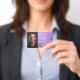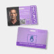 Modern ID badge design for private security professionals featuring your photo, name, job title, ID number, QR code, and expiration date. Back includes your company logo and return contact information. The bold purple layout ensures easy identification and professional branding.