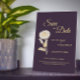 This Purple Daisy Antique wedding save the date combines a modern boho, vintage style design with a traditional, royal type of design. The dark plum and dusty lavender, contrasting the minimal floral, gold wildflowers along with the yellow calligraphy, create a simple but classy touch to your spring or summer marriage celebration.