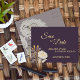 This Purple Daisy Antique wedding save the date announcement postcard combines a modern boho, vintage style design with a traditional, royal type of design. The dark plum and dusty lavender, contrasting the minimal floral, gold wildflowers along with the yellow calligraphy, create a simple but classy touch to your spring or summer marriage celebration.