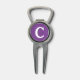 Modern divot tool, durable metal construction with integrated bottle opener. Includes customized, magnetically attached golf ball marker; this one is purple denim print and white initial. Easily change or remove initial using the Template provided. Unique gift for any golfer; physician, friend, family or boss. See "About This Product" at side for more information.