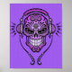 This elaborate DJ sugar skull design is decorated with intricate swirls and dot patterns. Headphones sit on top of the skull with two wires hanging below. A shadow falls onto the circular mesh background making it look like the skull is floating just above the surface. This aggressive Day of the Dead inspired image is perfect for musicians and music lovers.