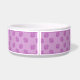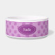 Purple dog paw print pattern background with a darker purple badge that has a personalizable text area for the name of the pet. The font is a lovely script font in white color.
