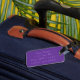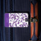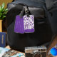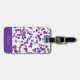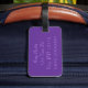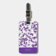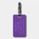 This luggage tag features a design of polka dots, in various shades of purple, and a bold purple stripe. The stripe, and background color on the back, as well as the monogram and text, can all be customized as desired.