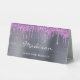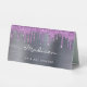 Purple Dripping Glitter Table Tent Sign. Fully customize this purple dripping glitter silver brushed metallic professional business table tent sign with your name and position title. This elegant glamorous stylish design fits particularly well for businesses and salons within the beauty, cosmetic and fashion industry.