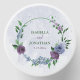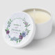 Beautiful romantic wedding mini candle tin favor featuring dusty blue and purple flowers and some green leaves .