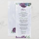 Beautiful romantic wedding menu card featuring dusty blue and purple flowers and some green leaves .