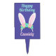 Beautiful Easter bunny birthday party cake topper for a pretty girl who loves cute cards. Happy Birthday written in teal and a custom name in lovely pink on the cool purple card.