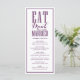 Eat, drink and be married. Complete your event tablescape with this customizable wedding menu card. It features modern calligraphy and classic typography, perfect for any wedding theme. Personalize by adding your details. Matching items are available. This purple menu card is available in other colors.