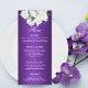 This exquisite wedding menu has an elegant and sophisticated design that sets the tone for your special day. The bold and eye-catching rich purple color of the menu is sure to grab your guests' attention, while the white roses at the top add a touch of elegance and romance. The simple white text makes the menu easy to read and complements the overall design. This menu is perfect for couples who want to create a memorable, stylish wedding with a beautiful and romantic atmosphere. Moreover, this menu is highly customizable and can be tailored to include your personal wedding menu details for the reception. Regardless of how you choose to personalize it, this stunning purple wedding menu with white roses will be a beautiful and memorable addition to your special day.