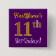 This simple square button design features a message like "FirstName’s 11th Birthday!", with the "11th" having a faux/imitation gold-like coloring look, on a purple colored background. The name can be customized. Buttons like these could perhaps be worn by guests at a birthday party for somebody who is celebrating their eleventh birthday, where the party is being held in a large area with lots of other people present (such as a city park or a theme park). [~Z0000166]