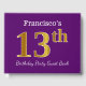 This guest book design features the ordinal number "13th" with a faux gold-like appearance. It also features a customized name, and a purple colored background. It could be used at a party for somebody celebrating their thirteenth birthday. [~Z0000057]