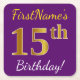 Purple, Faux Gold 15th Birthday + Custom Name Square Paper Coaster