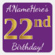 Purple, Faux Gold 22nd Birthday + Custom Name Square Sticker