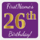 Purple, Faux Gold 26th Birthday + Custom Name Square Sticker
