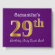 This guest book design features the ordinal number "29th" with a faux/imitation gold-like appearance. It also features a custom name, and a purple colored background. It could be used at a party for somebody celebrating their twenty ninth birthday. [~Z0000057]