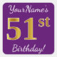 Purple, Faux Gold 51st Birthday + Custom Name Square Sticker
