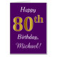 This simple birthday card design features the message "Happy 80th Birthday", with the "80th" having a faux gold-like appearance. It also features a personalized name, and a purple background. It could be given to somebody who is celebrating their eightieth birthday.