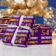 This wrapping paper design features a message like "REGINALD’S 54th BIRTHDAY!", with the "54th" having a faux/imitation gold-like color appearance, and with the name and "BIRTHDAY" in a fun, bold font. The name can be customized, and the background is colored purple. Wrapping paper like this could perhaps be used when wrapping birthday gifts being given to somebody in celebration of their fifty fourth birthday. [~Z0000206]