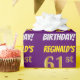 This wrapping paper design features a message like "REGINALD’S 61st BIRTHDAY!", with the "61st" having a faux/imitation gold-like color appearance, and with the name and "BIRTHDAY" in a fun, bold font. The name is customizable, and the background is colored purple. Wrapping paper like this could perhaps be used when wrapping birthday gifts being given to somebody in celebration of their sixty first birthday. [~Z0000206]