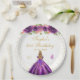 This elegant and glamorous birthday party plate features a beautiful princess with blonde hair and fair skin in a dark purple ball gown. The text combines handwritten script and modern sans serif fonts for a classy and sophisticated look. The floral arrangements, butterflies and gold confetti create the perfect blend of rustic and chic.