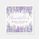 Add a whimsical and elegant touch to your bridal shower with these beautiful party napkins! Featuring a soft lilac and lavender floral theme, the design showcases delicate watercolor lavender stems in various shades of purple, paired with soft green leaves. The text is displayed in a mix of classic serif and elegant script fonts in purple and gray, creating a refined yet charming look.
