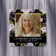 Celebration of life square funeral button featuring a stylish black background, elegant purple watercolor flowers, a photo of your loved one in a faux gold frame, their name, and birth/death dates.