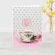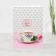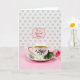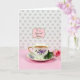 This card shows a soft still-life scene with a white teacup and saucer decorated in purple flower patterns and shiny gold details, set low in the design on a pale pink tabletop. The cup is filled with warm amber tea, and beside it a single pink rose leans gently as if placed by someone who cares, with fresh green leaves adding contrast ❤️. The background fades lighter toward the top, where faint gray heart shapes repeat like a quiet pattern of affection. Near the upper center, a scalloped frame in blush pink with gold edging holds the main message. The text reads “To a Special Mum” in a dark gray tone, centered neatly inside the frame. Soft pinks, creamy whites, deep purples, and touches of gold work together to suggest closeness and gratitude without needing extra decoration 🌼. Small gray heart silhouettes continue across the upper background behind the framed words.