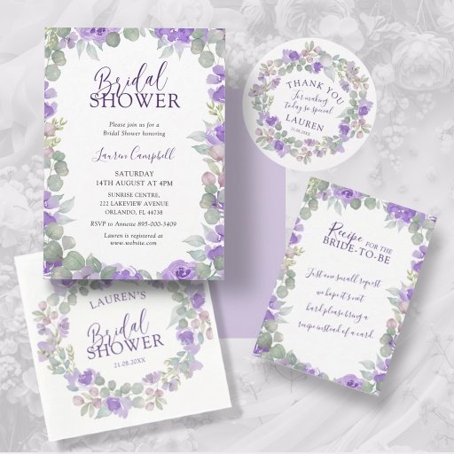 Purple Floral Watercolor Wreath Bridal Shower Paper Plates