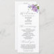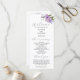 Elegant wedding program featuring watercolor illustration of purple peony with greenery. All the wedding ceremony information and the wedding party's name listed on this program.