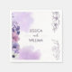 Elegant purple floral wedding napkins featuring soft watercolor flowers in lavender, blush, and white, paired with delicate botanical line art for a romantic and refined look. The airy white background and floral side border create a graceful design that is perfect for wedding receptions, cake tables, cocktail bars, dessert displays, and bridal celebrations. A beautiful choice for couples creating a coordinated floral wedding décor and stationery suite.
