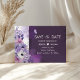 An elegant purple floral wedding save the date card featuring soft watercolor flowers in lavender, blush, and white, accented with delicate botanical line art and a graceful butterfly. The split layout with a deep plum panel creates a romantic and sophisticated look, making this card perfect for announcing your wedding date in style. A beautiful choice for garden weddings, spring weddings, summer celebrations, and coordinated floral wedding stationery suites.