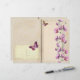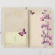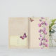 This double page spread style paper has a faint floral pattern background to set off beautiful purple flowers and butterflies. Added old paper and vintage postcard give the effect of collage. The back of the paper has faint ruled lines for your thoughts, aspirations and musings. Simply fold to create two ready made pages.