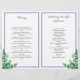 Floral funeral program in white with dark purple fonts, greenery, and blue and purple flowers. On the back you can write the obituary and program. Fold it yourself for a practical program.