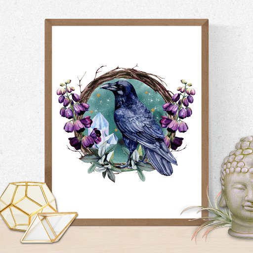 Metaphysical design with beautiful watercolor of a magickal crow, purple flowers, blue crystals and twig wreath with stars.