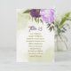 Beautiful wedding seating chart card featuring lilac and eggplant purple flowers and green leaves