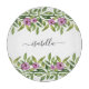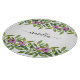 Purple flowers, greenery and typography spring cutting board. It features a garland and it is personalized with name in a calligraphy style font.