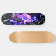 a decorative space artwork featuring a purple colored space nebula with planets and moons emerging from black space on a skateboard.