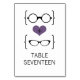 Quirky and chic Geeky Glasses Wedding Table Card featuring a purple heart flanked by two pairs of geeky eyeglasses, a manly pair and a girly pair representing the groom and bride. This offbeat but sophisticated table number card is perfect for your nerdy wedding! Easy to customize, simply add the appropriate table number(s) in the text fields provided. Click on the "Customize It" button to find additional personalization options.