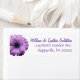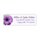 Purple gerbera daisy, custom return address labels. Matching purple template text with three lines for name and address on a skinny sticker. All text can also be deleted and the label can be purchased blank to print your own.