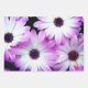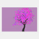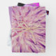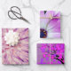 Gift wrapping paper with sheets that have images of purple flowers and hearts.