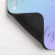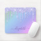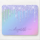 Personalized girly sparkly mouse pad featuring faux purple glitter dripping from the top against a unicorn pastel pink, purple, blue and green rainbow background. Add your first name in a stylish trendy purple script with swashes.