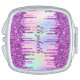 A rainbow, unicorn colored holographic background. Decorated with pink and purple faux glitter drips, paint dripping look. Personalize and add a name, written with a girly modern hand lettered style script. Purple colored letters.