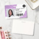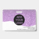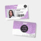 A modern, and professional purple glitter sparkles nurse photo id badge with logo and barcode horizontal layout.