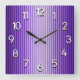 Wall clock with skinny purple stripes, white numbers with black shadow. Each stripe is made from even skinnier stripes in shades of purple from pale purple to lavender, mauve, amythest and deep purple. Purple is a color of royalty or status, wealth, confidence, mystique and higher awareness. You can also get this clock in round style small or large to suit your decor in kitchen, dining room, living room, bedroom, guest room, studio or wherever your heart desires. Original purple glow stripes pattern by Sylvia Chaume. Love all!