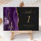 The left-hand edge of this elegant modern wedding table number card features a purple watercolor agate border trimmed with faux gold glitter. The customizable text combines gold colored handwriting, and italic and copperplate fonts on an off-black background.