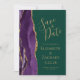 The left-hand edge of this elegant modern wedding save the date card features a purple watercolor agate border trimmed with faux gold glitter. The customizable text combines gold-colored handwriting, copperplate and italic fonts on an emerald green background. The reverse side features a matching purple and gold agate design.