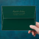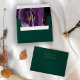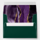 The inside of this elegant modern wedding invitation envelope features a purple watercolor agate design trimmed with faux gold glitter. Customize the back flap with the names of the bride and groom in gold-colored handwriting script and return address in copperplate font on an emerald green background.