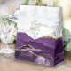 This elegant modern favor box features a purple watercolor agate design trimmed with gold faux glitter. Personalize it with the names of the bride and groom in gold-colored handwriting script over a large, pale gray ampersand, along with the wedding date in black below, on a gray and white marble background.